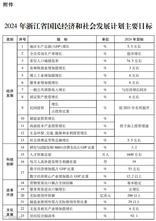 附件:2024年浙江省国民经济和社会发展计划主要目标