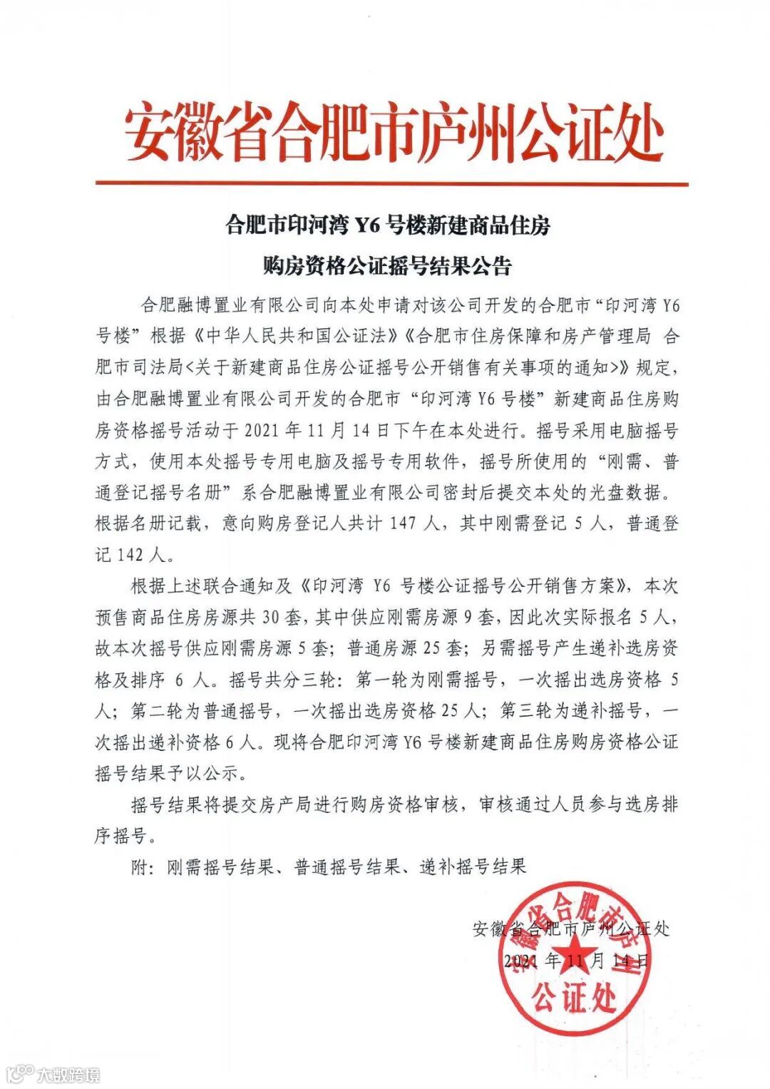市印河湾项目Y6#楼选房资格公证摇号于2021年11月14日在安徽省合肥市庐州公证处进行,现将刚需摇号结果、普通摇号结果、递补摇号结果公示如下: