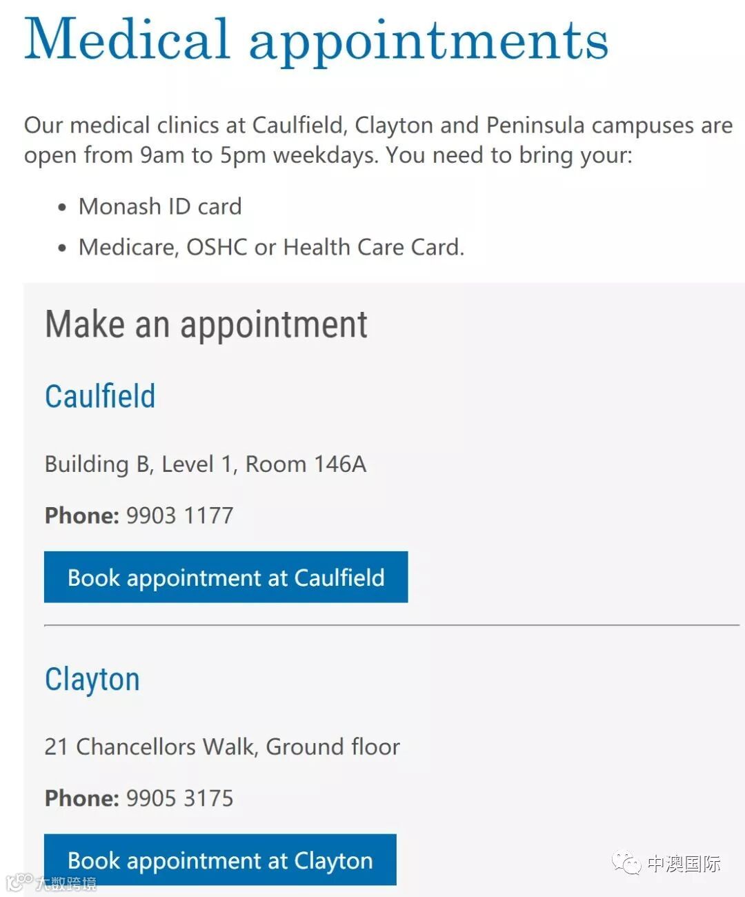 我们以Monash大学为例,登入官网后搜索Medical Services。一般学校官网都可以直接搜索到。