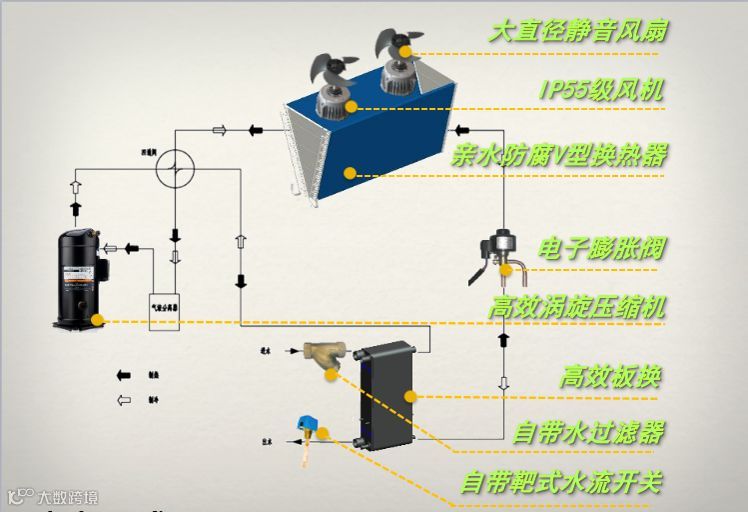 传统的间接式供冷、供暖系统最大短板是系统整体COP过低,系统换热过程中能量损耗较大,且系统自我调整能力较差,无法匹配末端需求侧负荷波动的控制需求,能源浪费较大。