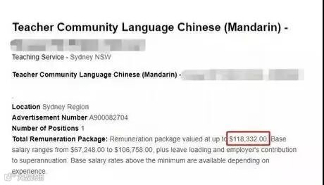 一张来自于悉尼某学校的招聘广告显示,该校中文教师的年薪已经达到了11.8万澳币!