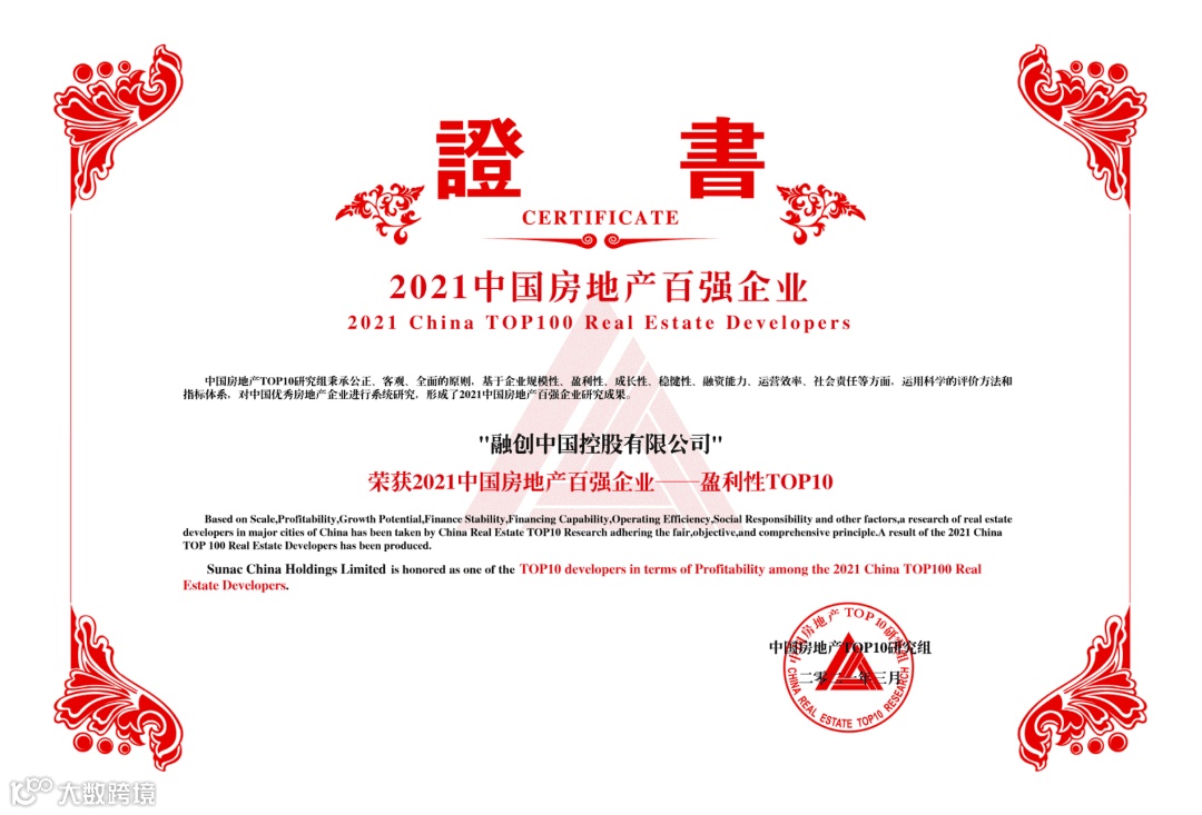 3月18日,在中指研究院发布的2021中国房地产百强企业研究成果中,融创荣获“2021中国房地产百强企业-运营效率”第一名,以及“2021中国房地产百强企业”综合实力、盈利性、规模性TOP10等多个奖项。融创文旅集团荣获“2021中国文旅地产运营优秀企业”称号。本次获奖,再次印证了行业对融创综合实力的认可。
