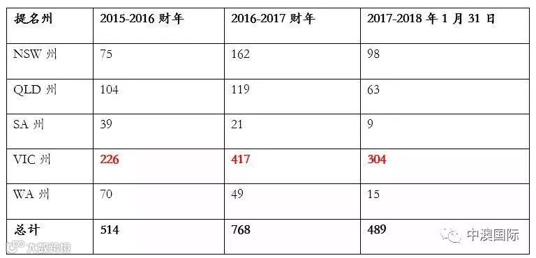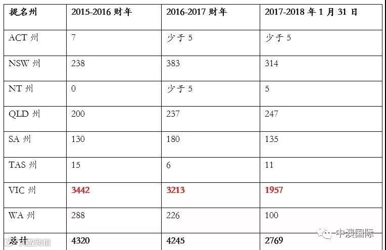 132B签证在近几财年仅在NSW周和VIC周有极少提名。此签证类别在近3个财年的申请人数都在100人以下。