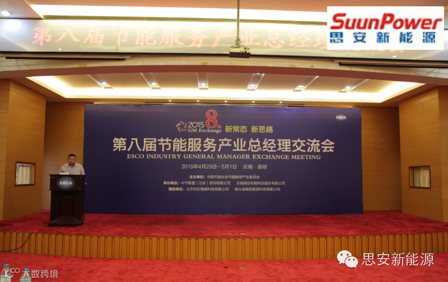 2015年4月29-5月1日,第八届节能服务产业总经理交流会在云南·昆明举行,本届的主题是:新常态,新思路,会议汇聚了70余位行业专家、节能服务公司董事长、总经理以及金融机构等代表。作为中国节能协会节能服务产业委员会(EMCA)的常务副理事长单位,思安新能源受邀参加本届节能服务产业总经理交流会。会上,思安新能源副总裁吴畏结合公司在分布式能源领域的实践,以实际案例向参会代表进行了详细的讲解,并与代表们展开了深入的交流。