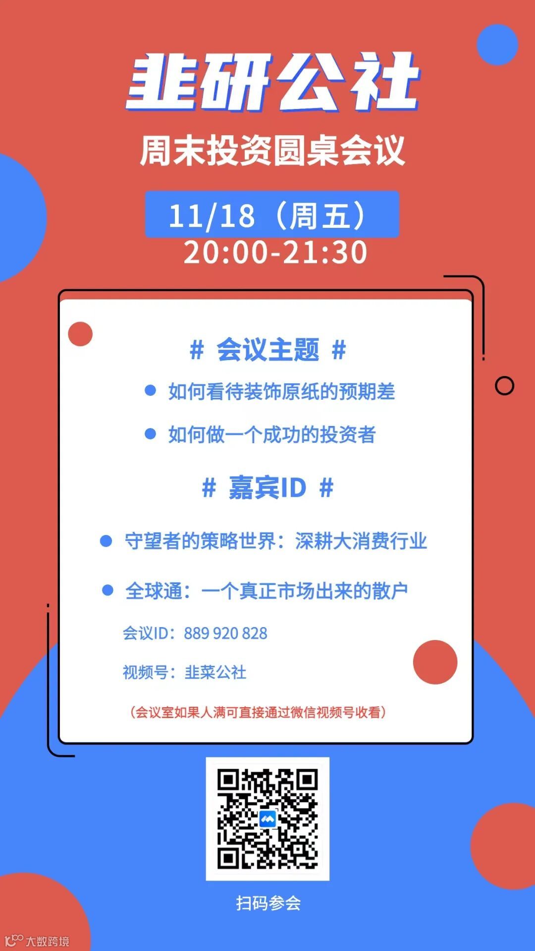 今天球总做客韭研公社投资圆桌会议,大家记得参加哈~ 参与方式,我放在了球总内容的后面。