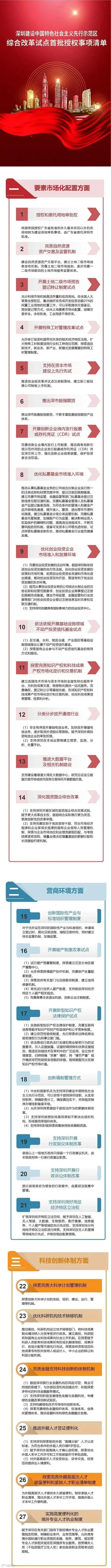 据国家发改委网站10月18日正式发布的《深圳建设中国特色社会主义先行示范区综合改革试点首批授权事项清单》显示,首批授权事项清单共有六大类40条。