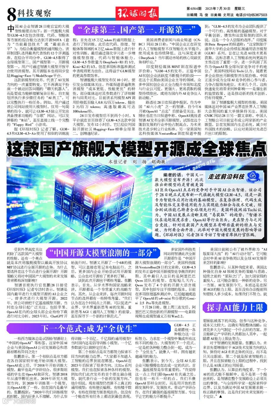 编者的话:中国又一款大模型宣布开源!此次推出新模型的是曾被美国AI巨头OpenAI点名的竞争对手中国AI企业智谱。该公司于28日晚正式发布新一代旗舰大模型GLM-4.5,这是一款专为智能体应用打造的基础模型,在复杂推理、代码生成及智能体交互等通用能力上实现能力融合与技术突破,综合测试性能已跻身全球领先行列。美国科技网站Techi认为,中国AI发展正清晰呈现“易获取”的趋势:“智谱不仅在追赶深度求索、OpenAI等行业巨头,更在努力与之同台竞技。”针对这款国产大模型具有哪些最新的特点与突破、为何要全面开源、此举对中国大模型发展的影响等话题,《环球时报》记者28日专访了智谱首席执行官张鹏。