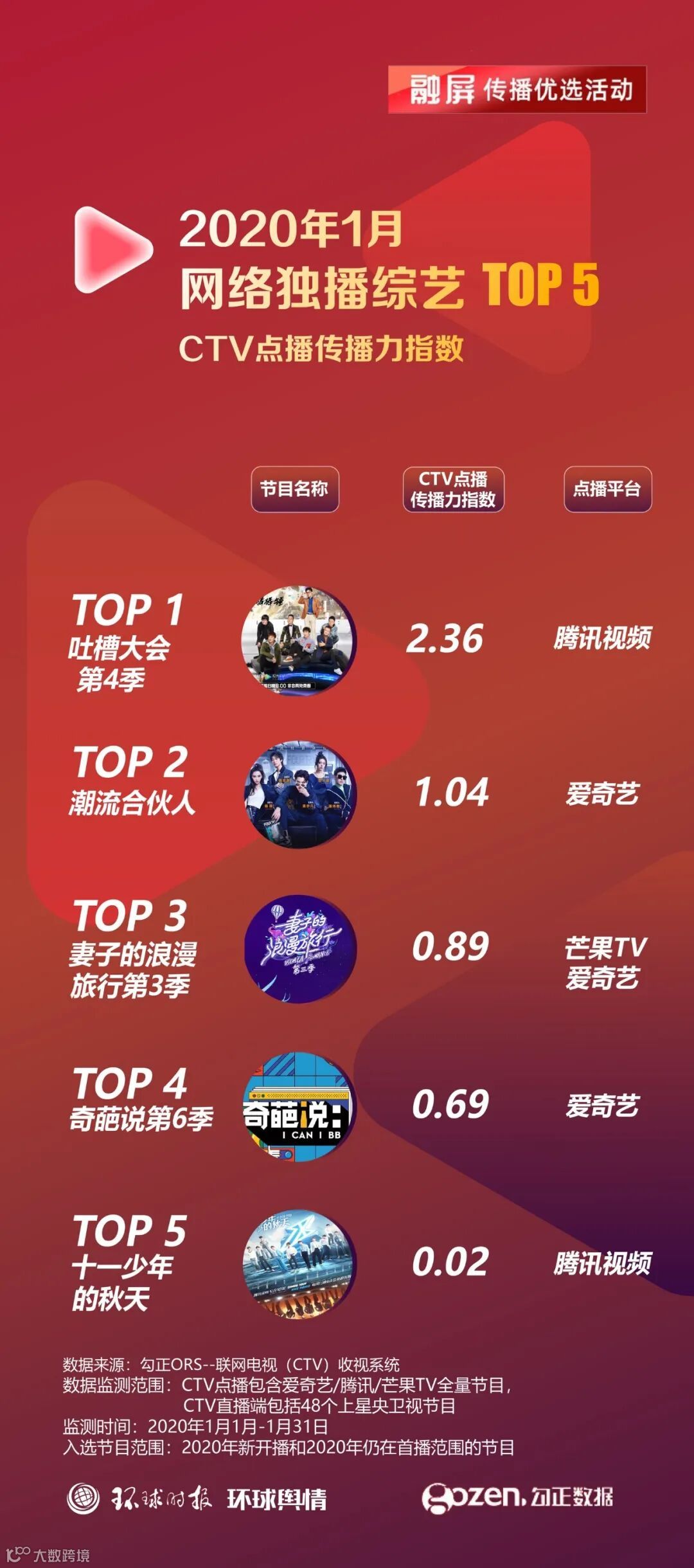 2020年1月网络独播综艺CTV点播传播力指数TOP5