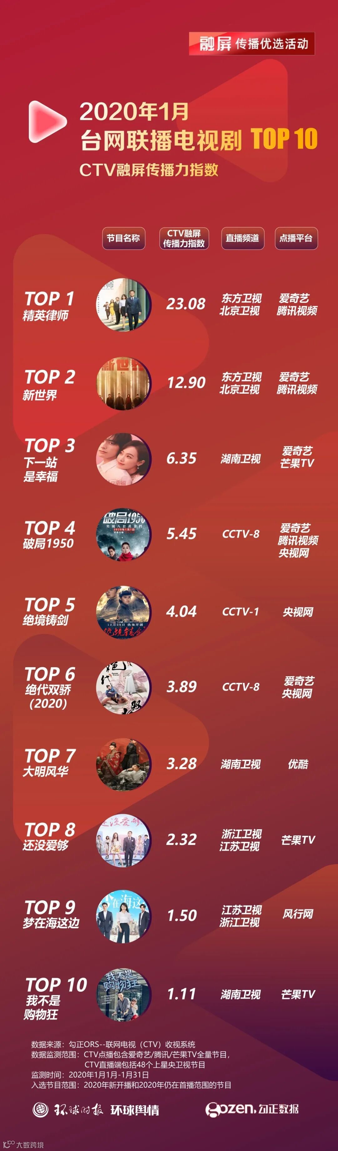 2020开年,“融屏之战”已经打响,环球时报舆情中心携“融屏传播优选”系列活动回归,重磅推出“CTV融屏传播力指数月榜”,每月带您“以数读剧”,从融屏视角追踪热播节目的传播变化。