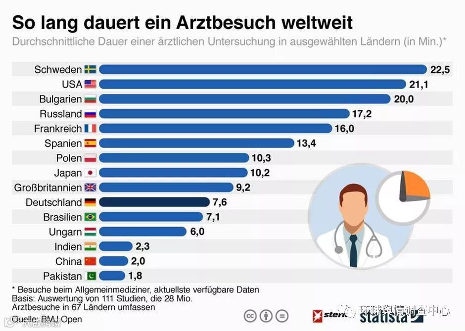 德国人平均每年去看医生17次。医生总是抱怨病人太多,看诊时间太少。美国或瑞典的医生每次看一个病人能分配20分钟以上,而德国只能分配给每个病人不到8分钟!下面是各国医生看病时间的比较图: