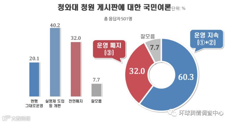 当问及“您是否支持废除以‘国民沟通’为目的运营的韩国青瓦台请愿告示板”时,60.3%的韩国受访者表示“反对废除,应继续运营”,其中40.2%的人认为“为阻止恶意留言,应引入实名制”,20.1%的人认为“为保证传递国民声音,须按照现行方式继续运营”;32.0%的人认为“为防止激化社会矛盾,应全面废除”,7.7%的人表示“难以回答”。
