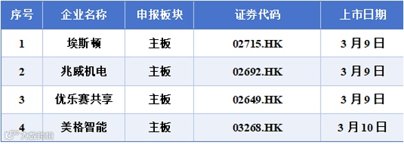 据统计,3月8日至3月14日期间,港股市场共有6家公司提交招股书,5家公司通过聆讯。此外,有3家公司进行招股,4家企业挂牌上市。