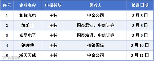 3月8日至3月14日期间,和辉光电、凯乐士、泽景电子、铜师傅、瀚天天成共5家公司通过聆讯。