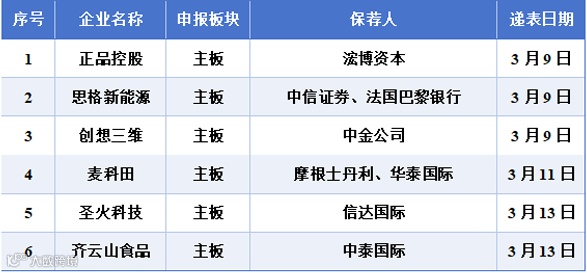 3月8日至3月14日期间正品控股、思格新能源、创想三维、麦科田、圣火科技、齐云山食品向港交所递交上市申请。