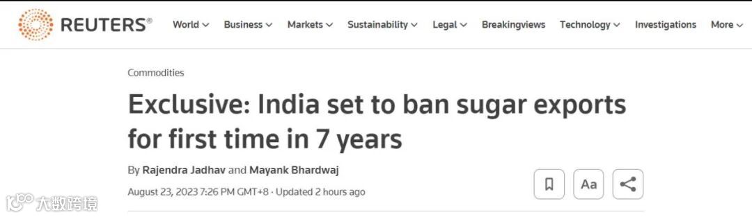昨晚,据路透社报道,三位印度政府消息人士称,由于降雨不足导致甘蔗减产,印度预计将在10月开始的2023/2024年度禁止糖厂出口,这将是七年来首次停止出口。