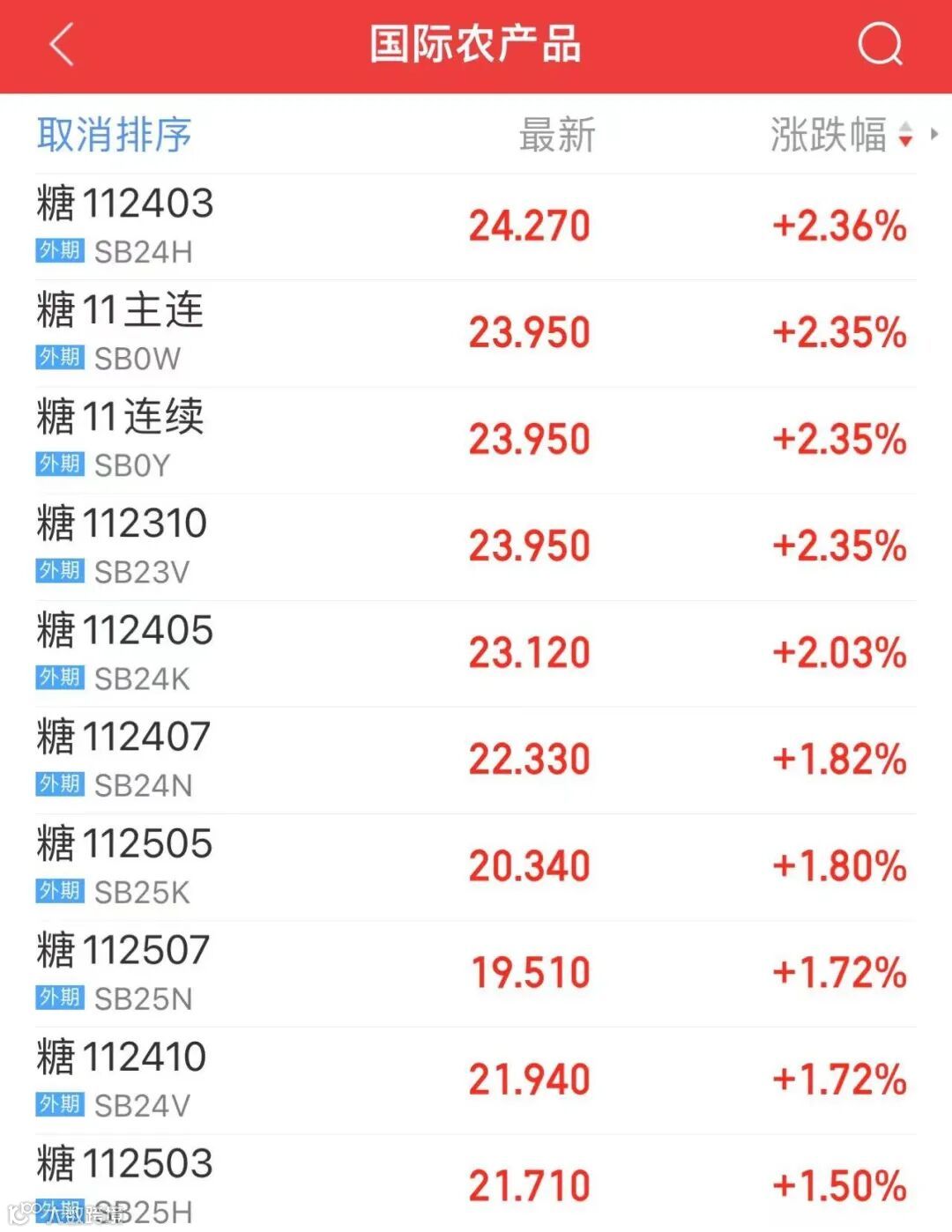 消息发布后,洲际交易所(ICE)美国11号原糖期货全线上涨,近月合约一度涨超3%。郑商所白糖期货主力合约涨近2%。