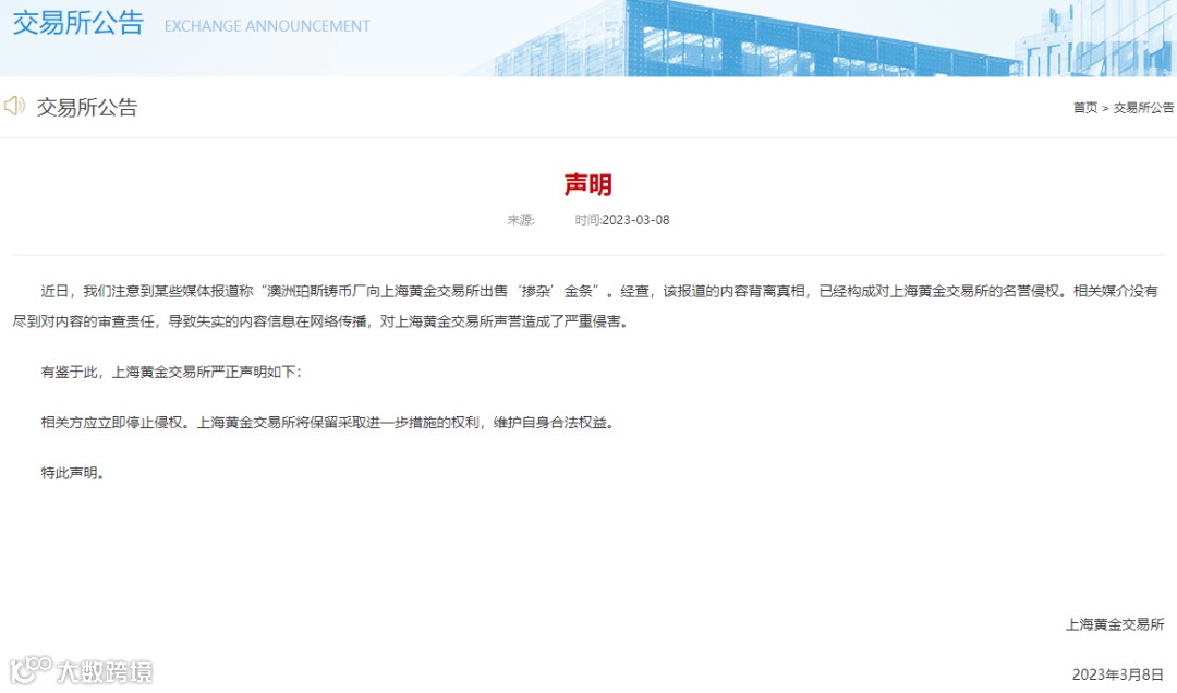 3月8日,上海黄金交易所(下称“上金所”)发布声明称,近日注意到某些媒体报道称“澳洲珀斯铸币厂向上金所出售‘掺杂’金条”。经查,该报道的内容背离真相,已经构成对上金所的名誉侵权。相关媒介没有尽到对内容的审查责任,导致失实的内容信息在网络传播,对上金所声誉造成了严重侵害。