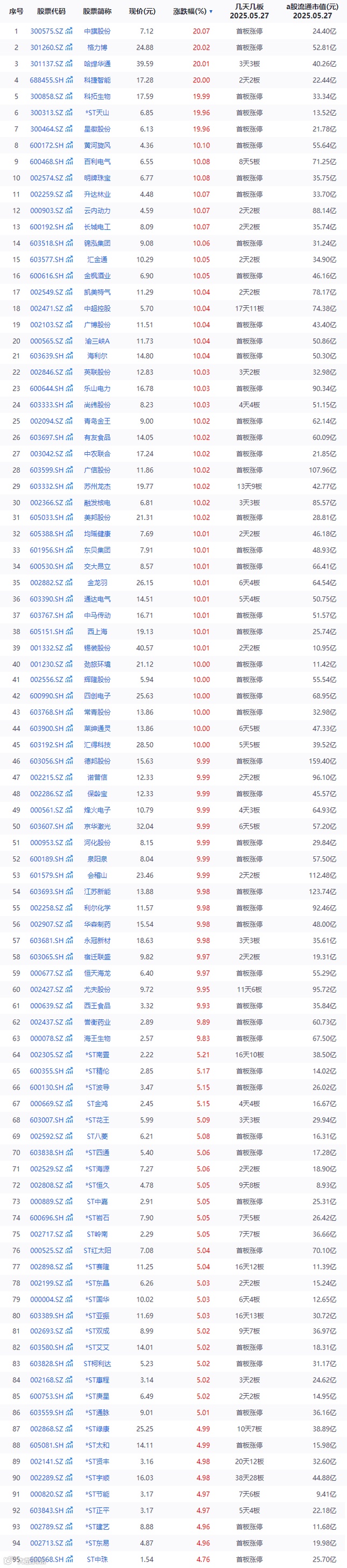 今日涨停个股