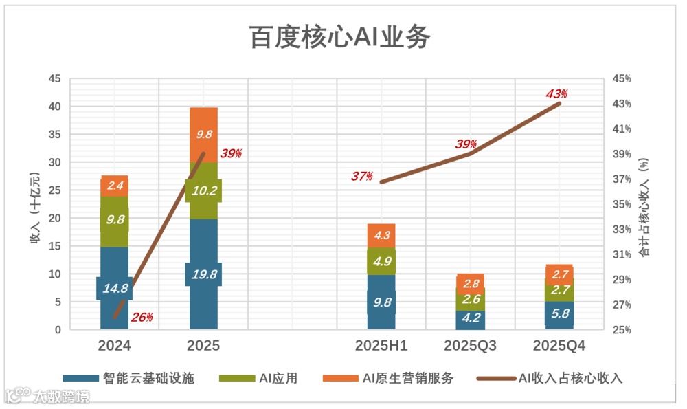 2025年三季报开始,百度推出“全新AI原生视角”,按照产品、服务与AI的关联程度对核心业务进行梳理——尝试绑定AI的归为“核心AI新业务”、正在“AI化”的归为“其他一般性业务”。