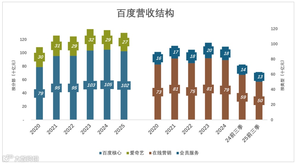 2025年,百度核心营收1024亿、同比下降2.2%;爱奇艺营收273亿、同比下降6.6%(不考虑分部间抵消)。