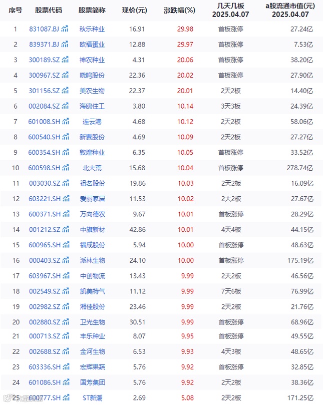 涨幅居前:共有24只股涨停,涨幅超过10%的股票共有16只。其中,秋乐种业涨幅达29.98%,欧福蛋业涨幅29.97%,康农种业涨幅24.5%,神农种业涨幅20.06%,晓鸣股份涨幅20.02%,美农生物涨幅20.01%,永顺生物涨幅12.19%,海鸥住工涨幅10.14%,连云港涨幅10.12%,新赛股份涨幅10.09%,敦煌种业涨幅10.05%,北大荒涨幅10.04%,祖名股份涨幅10.03%,爱丽家居涨幅10.02%,万向德农涨幅10.01%,中旗新材涨幅10.01%。