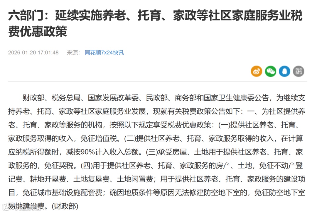 六部门:延续实施养老、托育、家政等社区家庭服务业税费优惠政策。
