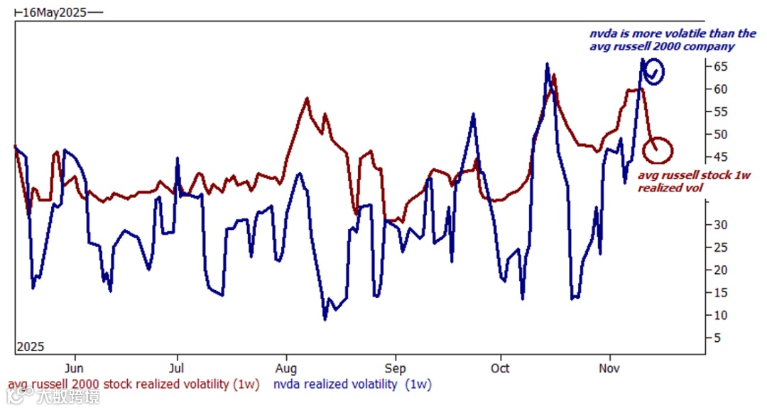 英伟达的历史波动率已超过罗素2000指数成分股的平均水平。考虑到英伟达的市值(约4.6万亿美元)是罗素2000指数中普通公司(平均约17亿美元)的2500多倍,并且其流动性远非后者可比,这种波动率倒挂凸显了当前市场中大型科技股所面临的巨大不确定性。