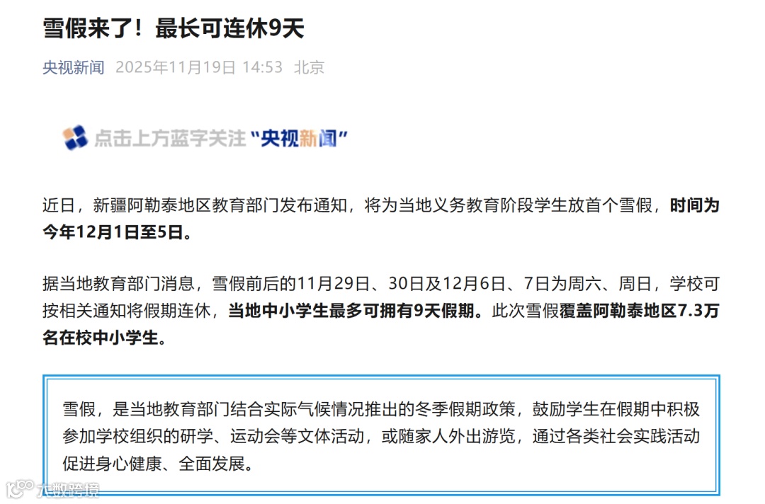 近日,新疆阿勒泰地区宣布为当地义务教育阶段学生设立首个“雪假”(2025年12月1日至5日)。