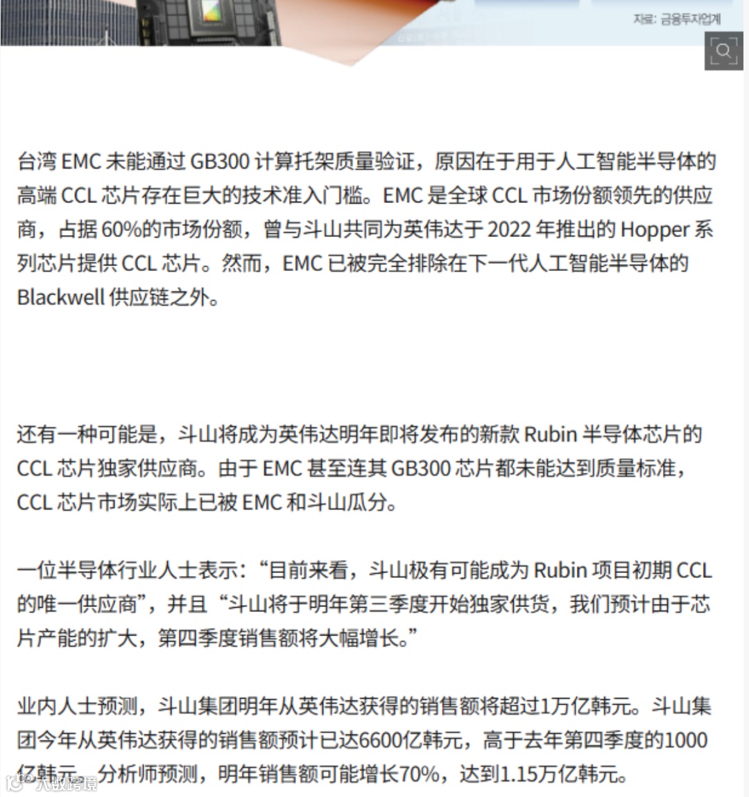 CCL市场实际被斗山和EMC瓜分,由于EMC连GB300芯片都未达标,斗山有可能成为英伟达Rubin芯片项目初期CCL的唯一供应商。