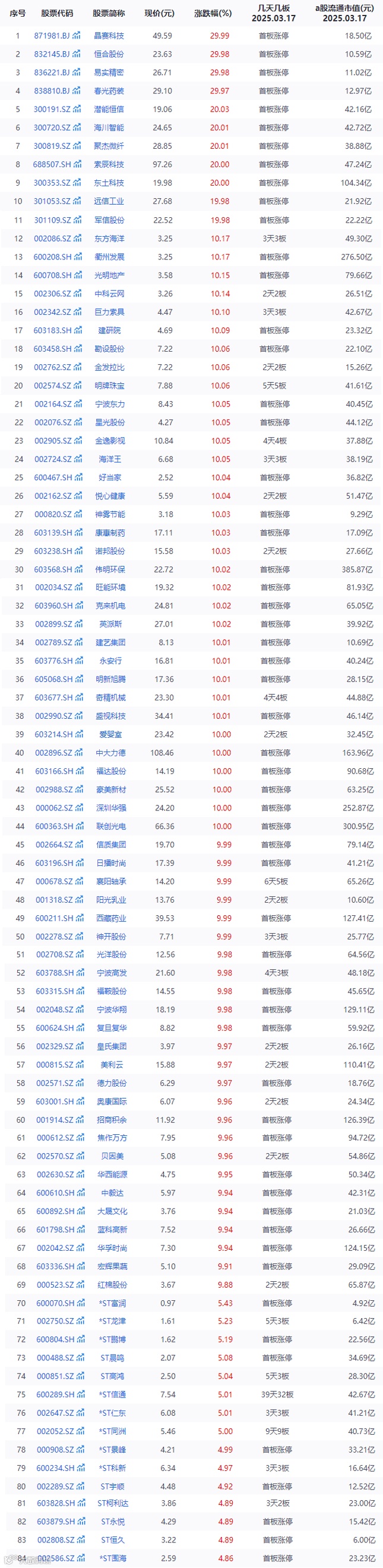 2025年3月17日,A股市场三大指数呈现出涨跌不一的态势。截至收盘,沪指表现较为稳健,上涨0.19%,报收3426.13点,延续了近期的相对强势格局,显示出市场对于大盘蓝筹股等权重板块的支撑依然存在;深成指则出现0.19%的跌幅,收于10957.82点,该指数包含了众多行业的代表性企业,其下跌反映出部分行业及个股面临一定调整压力;创业板指跌幅稍大,下跌0.52%,报收2215.13点,创业板以成长型企业为主,通常对市场风险偏好及行业竞争格局变化更为敏感,此次下跌或暗示成长股领域的短期波动加剧。