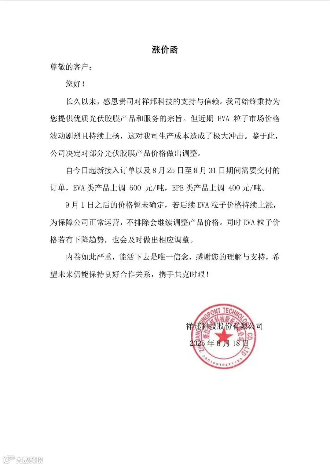 据悉,祥邦科技 8 月 18 日起调整部分光伏胶膜价格,EVA 类产品上调 600 元 / 吨 ,EPE 类上调 400 元 / 吨,粒子成本增加叠加供需改善预期是涨价主因是。