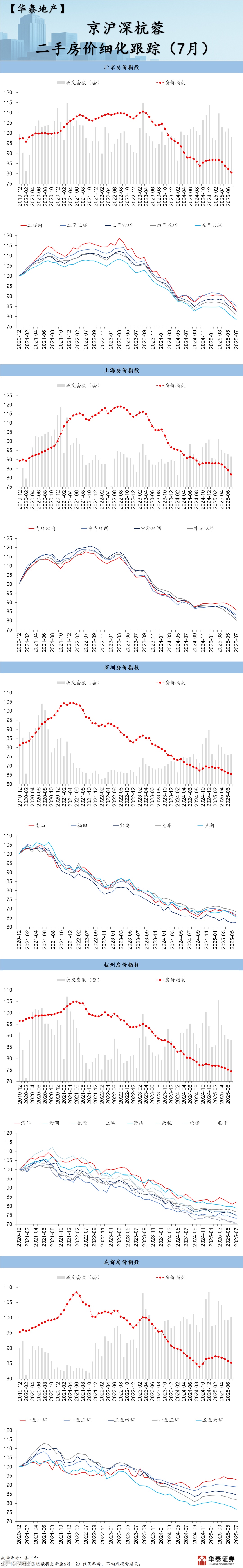 华泰更新了北京、上海、深圳、杭州、成都 5 城 7 月二手房成交价指数,7 月各城市二手房价有压力、核心城市区域房价多下行。