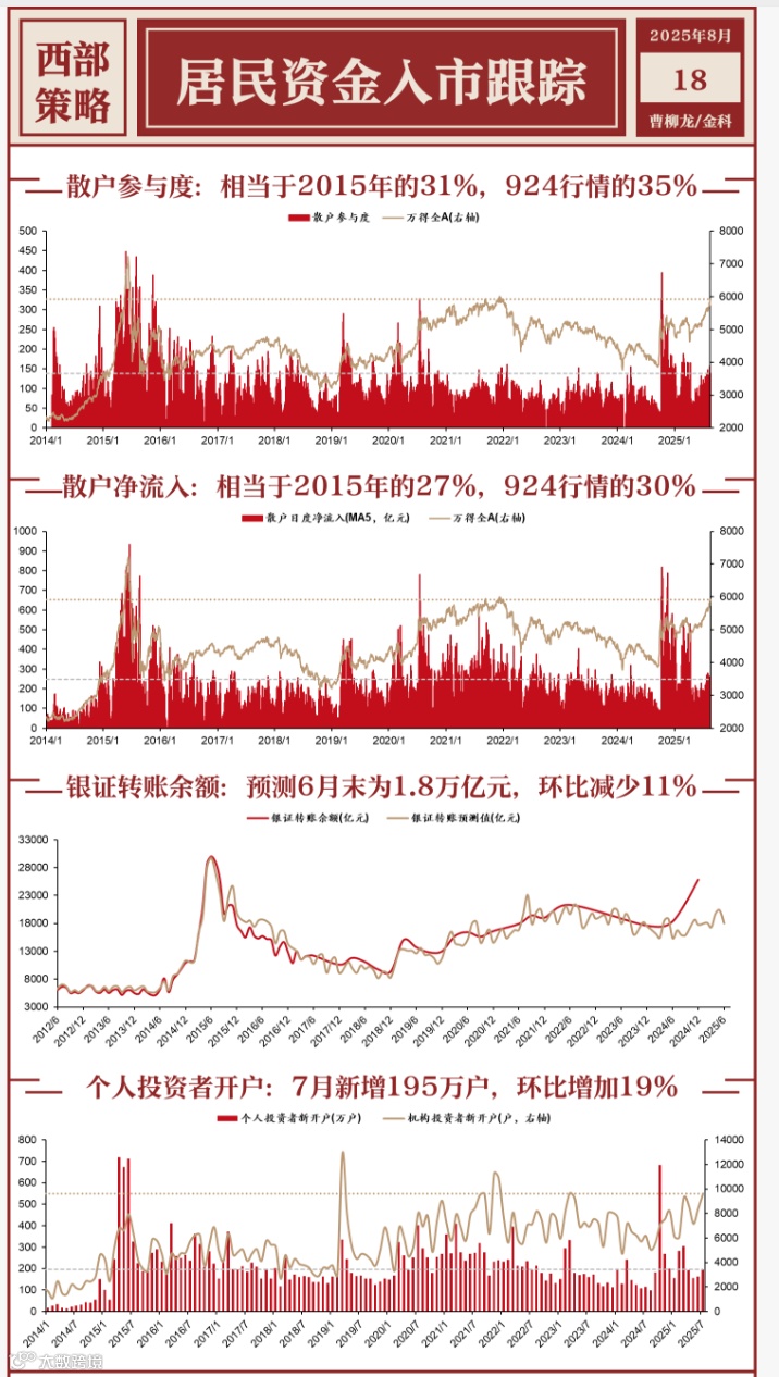 据西部策略,散户参与度:相当于2015年的31%,924行情的35%;散户净流入:相当于2015年的27%,924行情的30%。