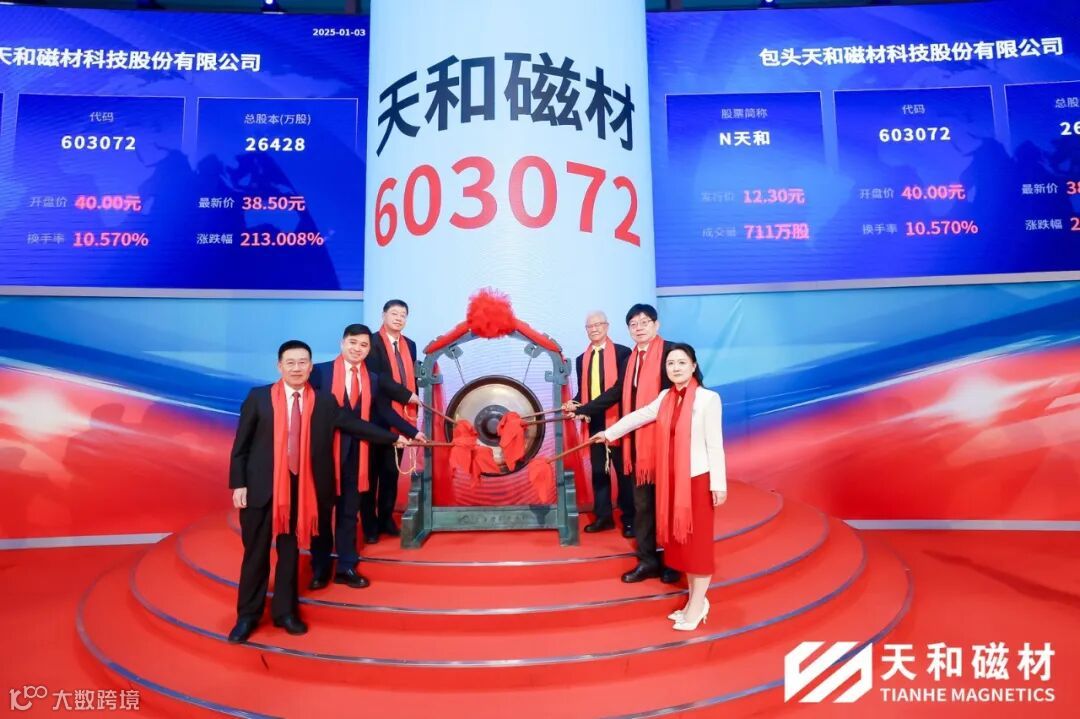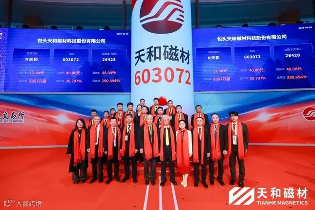2025年1月3日,天和磁材科技股份有限公司(证券简称:天和磁材,证券代码:603072)正式登陆上海证券交易所主板市场。本次发行价定为12.30元/股,截至当日午盘,股价上涨372.03%,换手率达到61.65%,喜迎开门红。