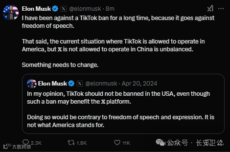 目前允许 TikTok在美国运营,但不允许X在中国运营的情况不平衡
