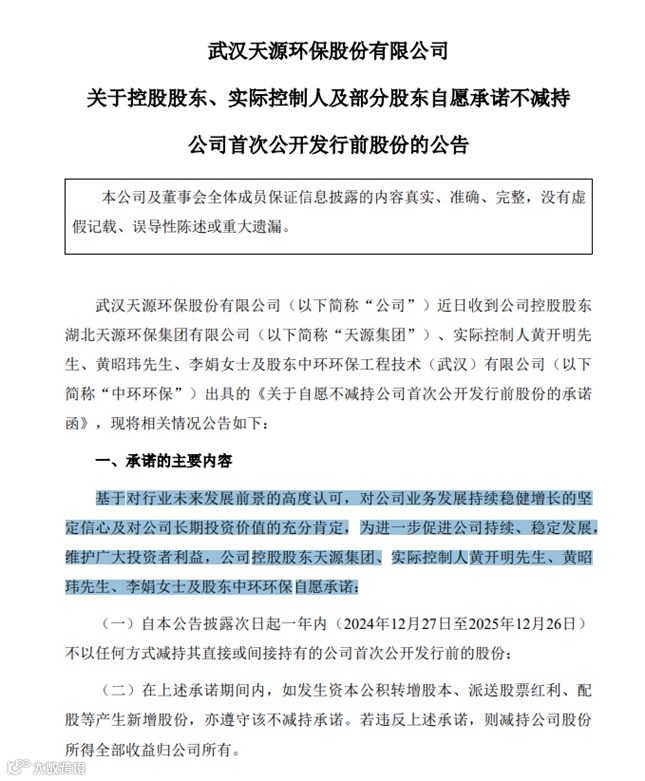12月26日,环境治理龙头企业天源环保(301127)发布公告,公司控股股东天源集团、实际控制人黄开明、黄昭玮、李娟及股东中环环保(300692)自愿承诺,自公告披露次日起一年内不减持其直接或间接持有的公司首次公开发行前的股份。承诺期间,如发生资本公积转增股本、派送股票红利、配股等产生新增股份,亦遵守该不减持承诺。