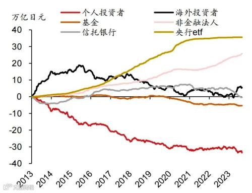 不过,日本股市的这轮十年慢牛,日本居民并不太买账;所以出现了央行用真金白银买指数ETF,居民却“用脚投票”不停卖的奇怪场面。