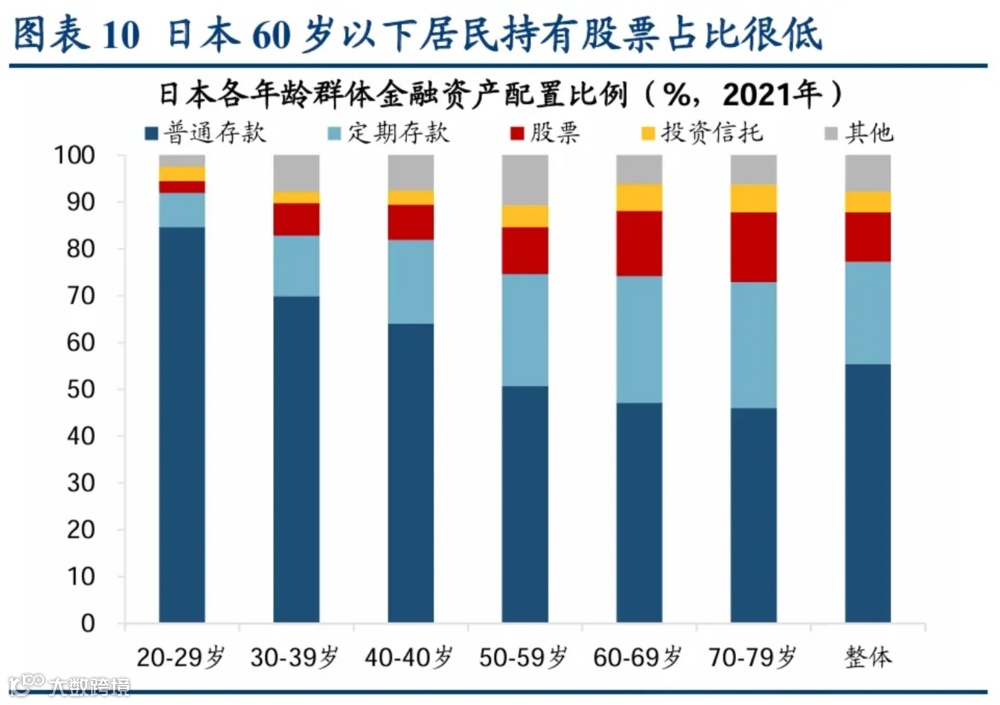 即便面对股市长年上涨,日本居民股票类金融资产占比只维持在13~14%左右的较低水平;而且持有股票占比最高的为60岁以上群体,1990年泡沫破裂之后出生的日本年轻人几乎不买股票。
