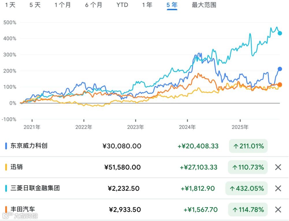 2012年后,日本央行开始大规模量化宽松(QQE),日元大幅贬值,出口企业盈利显著改善。丰田、索尼、日立等出口型公司利润暴增,成为日经225最初上涨的主要推手。日本高端制造、消费领域跑出不少10倍牛股。