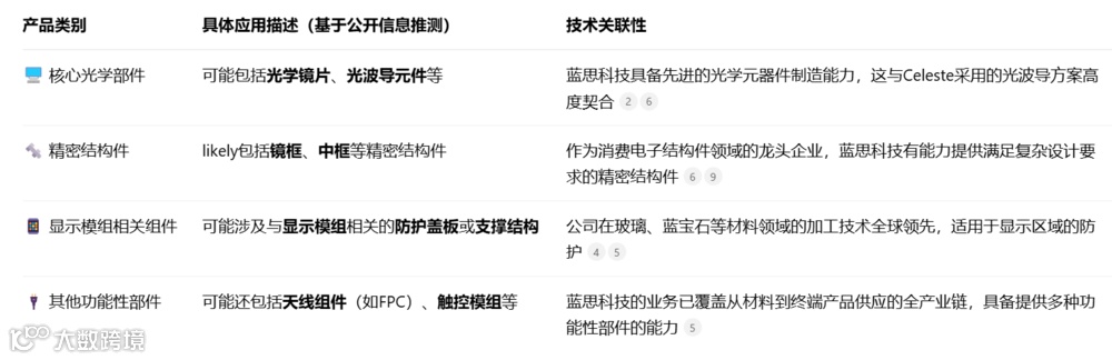 根据公开报道,蓝思科技在Meta即将发布的Celeste智能眼镜中扮演了重要的供应商角色。虽然具体的产品细节披露有限,但目前已知的信息表明,可能会提供下列产品: