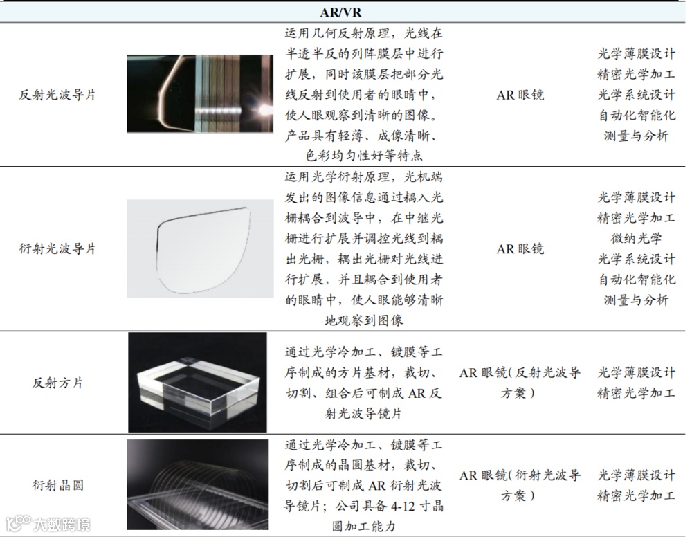 公司扎根 AR/VR 领域十余载,专注反射光波导、衍射光波导和光机技术的研发创新,分别与全球领先企业 Lumus、Digilens 战略合作布局反射光波导、衍射光波导技术,现已形成显示系统(波导片)、光机内的光学元器件以及其他智能头戴设备需要采用的 2D、3D 相关光学产品的业务布局。此外, 公司积极推动核心光学元件从传统智能手机向 AR/VR 智能眼镜领域的平移,持续发挥在消费电子领域积累的优势,抢占市场先机。