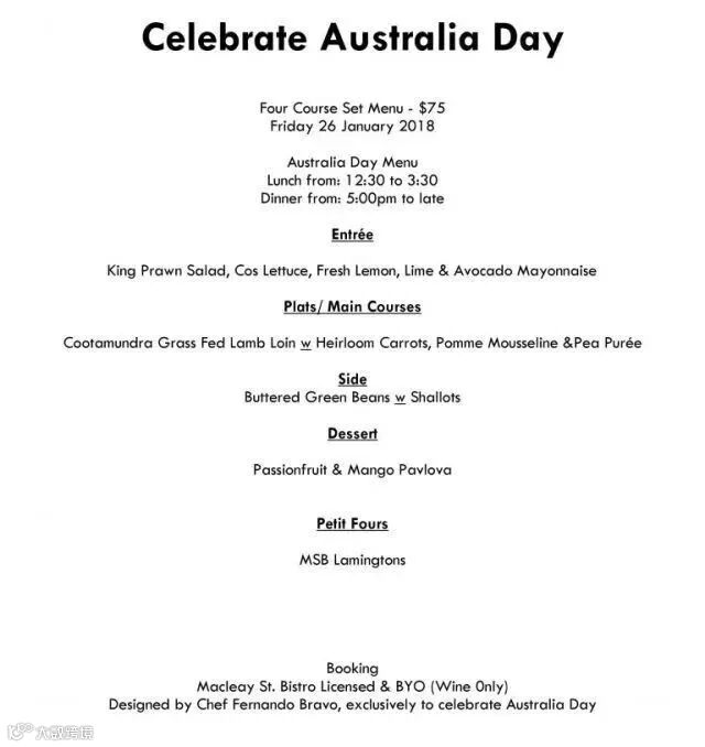 在澳洲,前菜有时候并不包括沙拉,一些餐厅会将沙拉归到主菜中。接下来我们来看看下面这个专为澳洲国庆日制作的餐单: