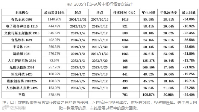 据统计,在时间上,主线持续时间最短的是168天,大约半年时间,大部分主线行情持续时间是超过一年的。最为波澜壮阔的主线行情可能包括:2005年-2007年的有色金属,2013年-2015年的文化传媒,2016-2021年的食品饮料以及2019-2021年的新能源。主线行情的空间特征也尤为明显,多数是翻倍的,只有2023年的人工智能指数的机会不到75%。