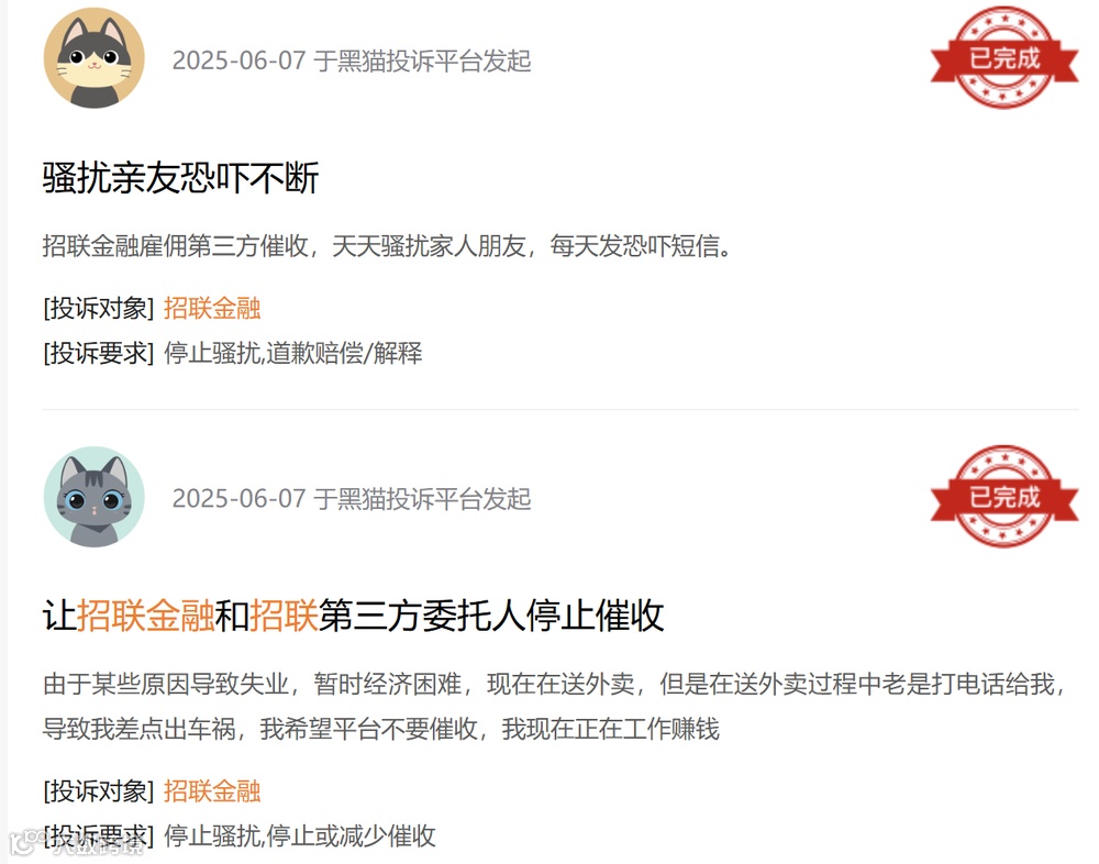 据黑猫投诉,不少用户表示,因逾期招联金融雇佣第三方催收公司,给家人朋友发恐吓短信。甚至,有用户表示在送外卖中被多次电话催收,导致差点出车祸。