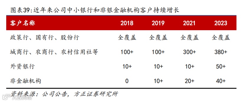 宇信科技主动调整客户结构,聚焦国有大行、股份制银行及政策性银行,中标核心系统、信贷、数据监管等高附加值项目,例如:宇信科技中标国家开发银行2024年网上银行电子发票及资产托管功能改造项目等。