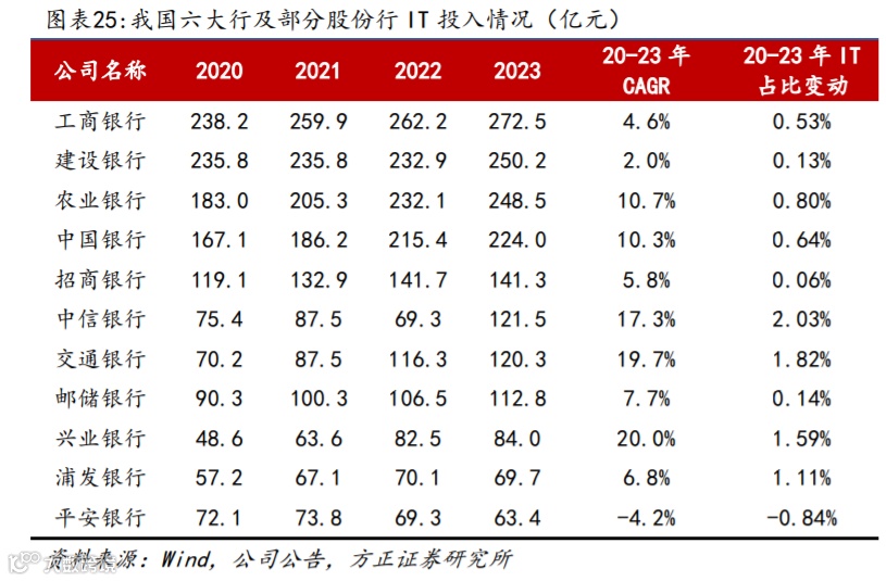 据方正证券统计,2020年-2023年六大行及部分股份行IT投入的复合增长率为7.97%。