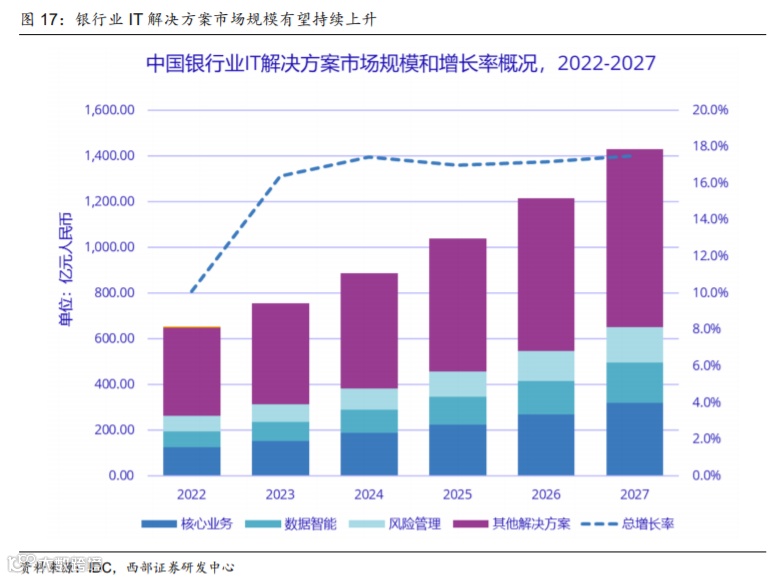 在市场方面,根据IDC数据,2023年国内银行业IT解决方案市场规模为692.96亿元,与2022年648.8亿元相比,同比增长6.8%,增速仅为个位数。