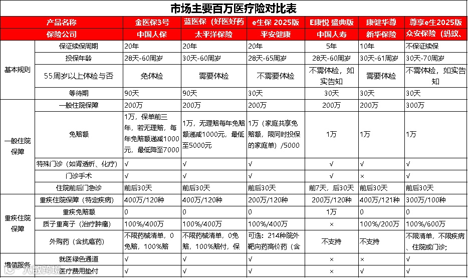 如中国人保的好医保标准版、中国太保蓝医保(好医好药版)、平安健康的e生保(2025版,家庭共享1万元免赔额,限同时投保的家庭单)、中国人寿的E康悦盛典版、新华保险的康健华尊以及众安在线的众民保(经典版)等主流产品,均有1万元免赔额的赔付限制。