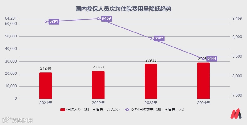 而据医保统计数据,DRG模式试点以来,国内参保人员次均住院费用呈下降趋势。进一步拆分2024年数据看,职工医保次均住院费用11169元,住院人次8652万人次;居民医保次均住院费用7295元,住院人次20530万人次。
