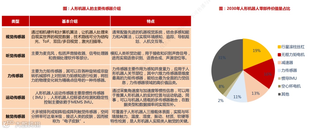 传感器是机器人感知物理世界的窗口,也是机器人迈向智能化的基础。包含各类视觉传感器、听觉传感器、触觉传感器、力传感器等,用于感知环境,获取关于周围世界的信息。目前一台通用人形机器人需要1套视觉传感器、1套位置传感器、14个一维力矩传感器、 14个一维压力传感器、 4个六维力矩传感器、10个MEMS触觉传感器(手指部位)、1套薄膜传感器。